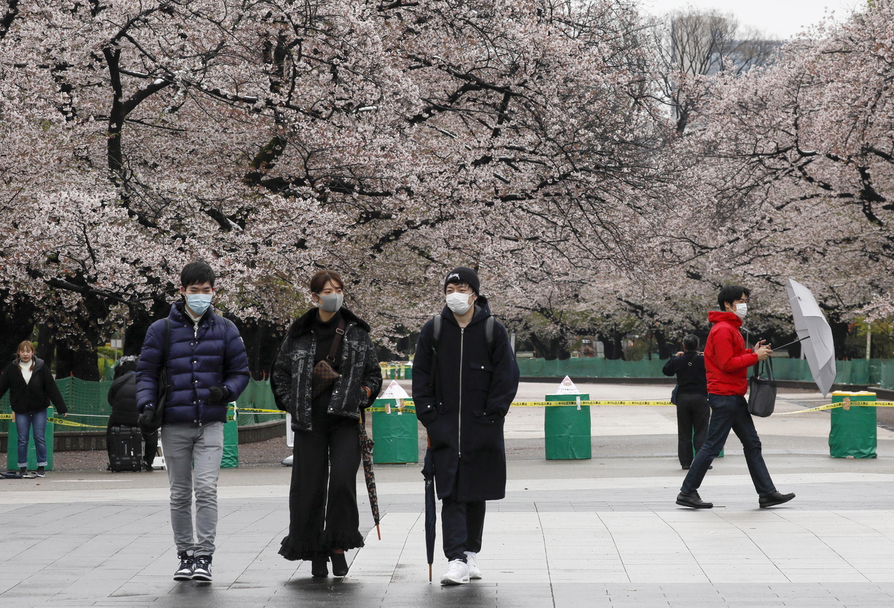 Visitors walk through cherry blossoms at Ueno Park in Tokyo, Japan, on March 29, 2020.