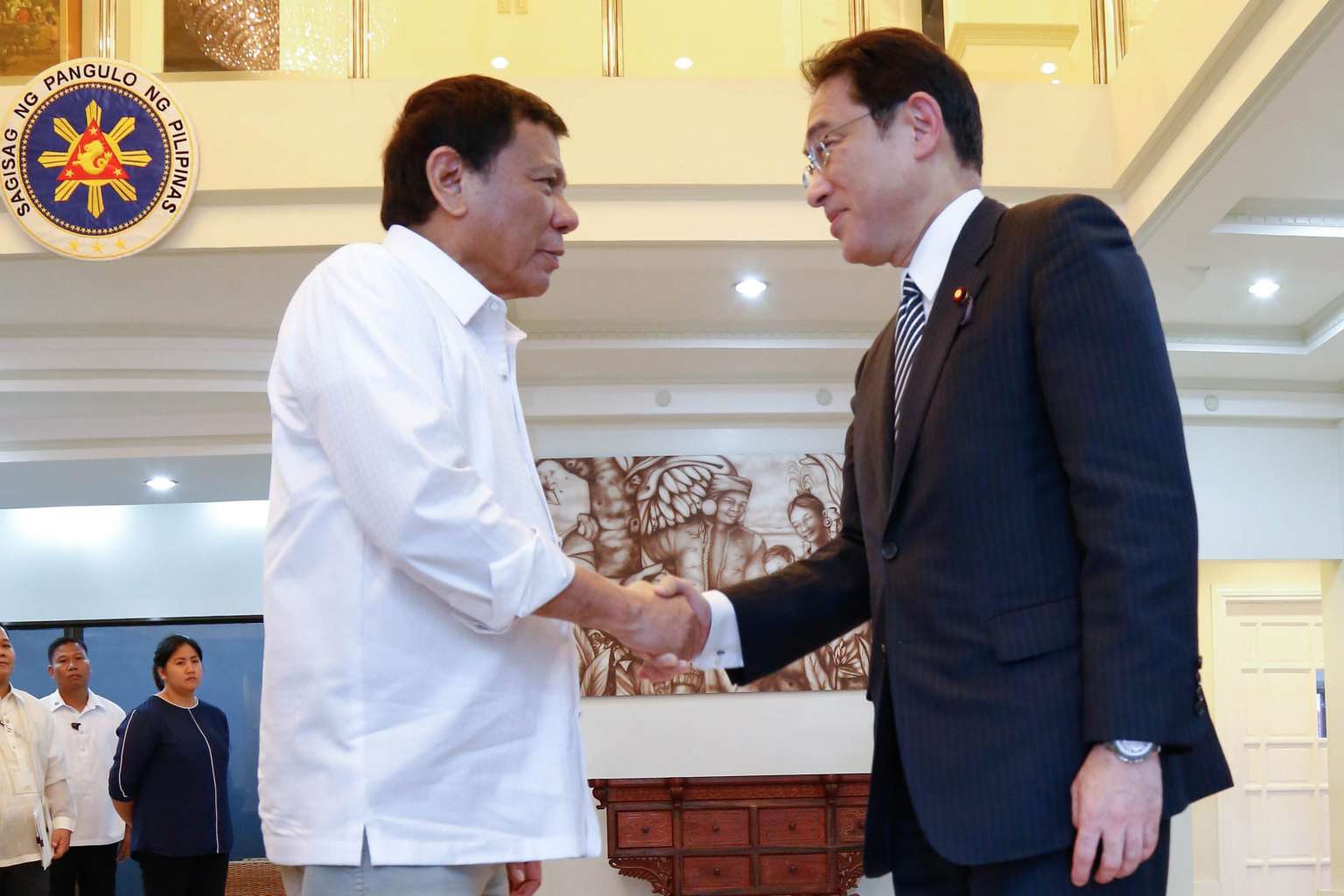 Philippine President Rodrigo Duterte (left) shakes hands with Japanese Foreign Minister Fumio Kishida during a courtesy call at the presidential guest house in Davao city on Aug 11, 2016.