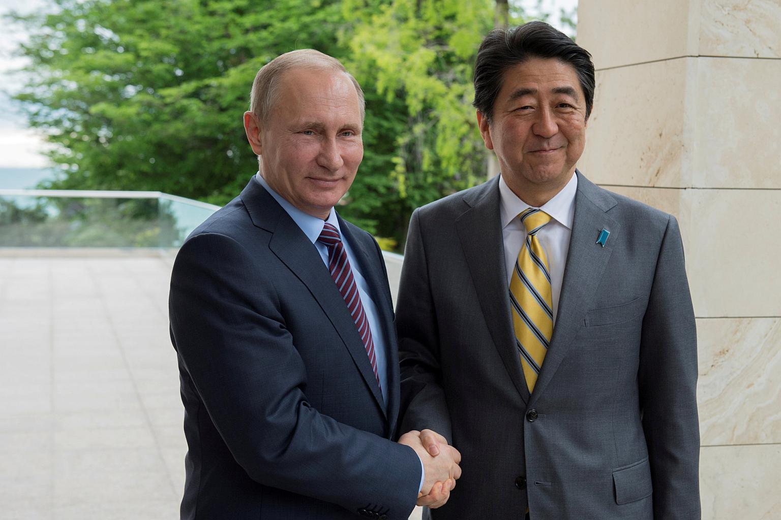 Russian President Vladimir Putin (left) with Japanese Prime Minister Shinzo Abe during a meeting at the Bocharov Ruchei state residence in Sochi, Russia, May 6, 2016.