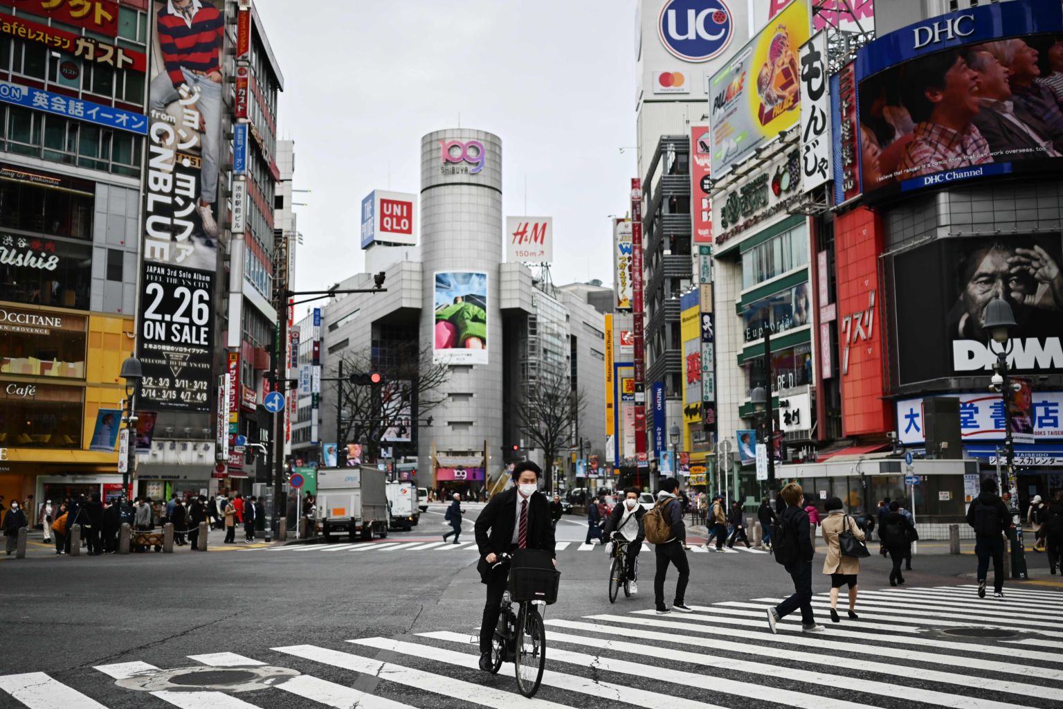 A man wearing a face mask rides a bicycle across a zebra crossing in Tokyo on March 9, 2020.