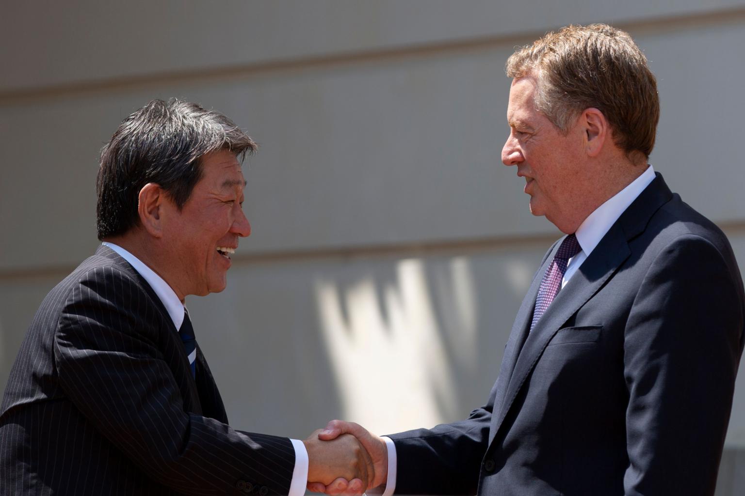 Japanese Economy Minister Toshimitsu Motegi and US Trade Representative Robert Lighthizer shake hands prior to negotiations at the Office of the United States Trade Representative in Washington on Aug 1, 2019.