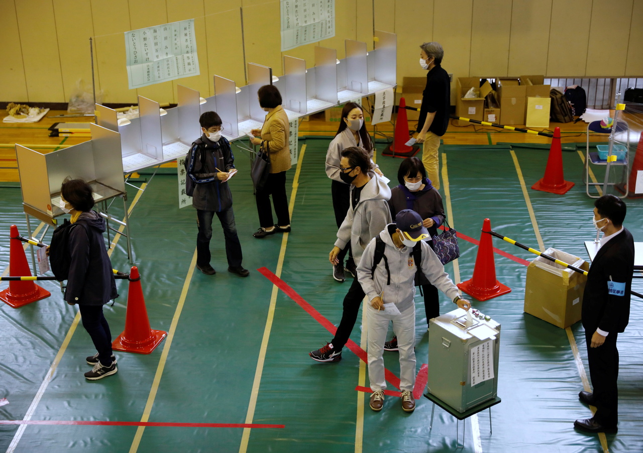 Voters casting ballots in the Lower House election at a polling station in Tokyo on Oct 31, 2021.
