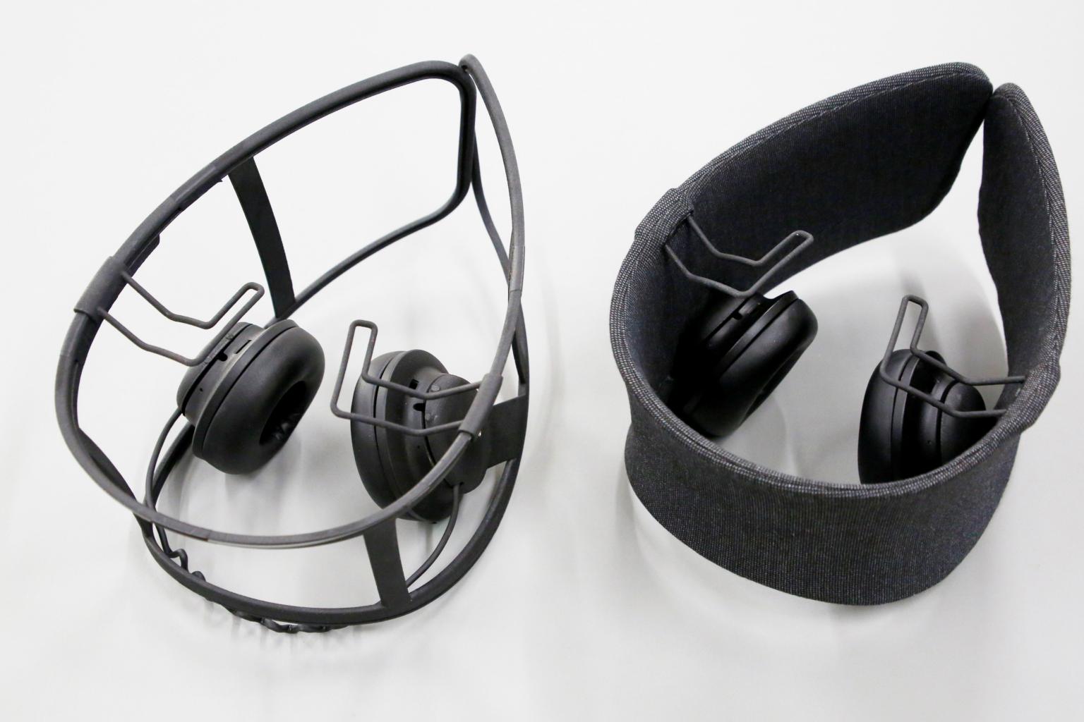 A Panasonic designer demonstrates a prototype of the "Wear Space" headset, which limits noise and peripheral vision.