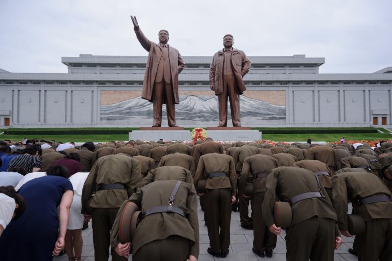 Soldiers bowing before the statues of late North Korean leaders Kim Il Sung and Kim Jong Il at Mansu Hill on in Pyongyang, on July 8, 2018.