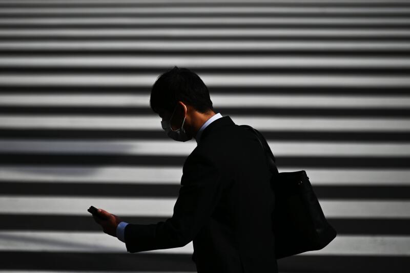 A man wearing a protective face mask crosses a street in Tokyo's Shimbashi area, on March 13, 2020.