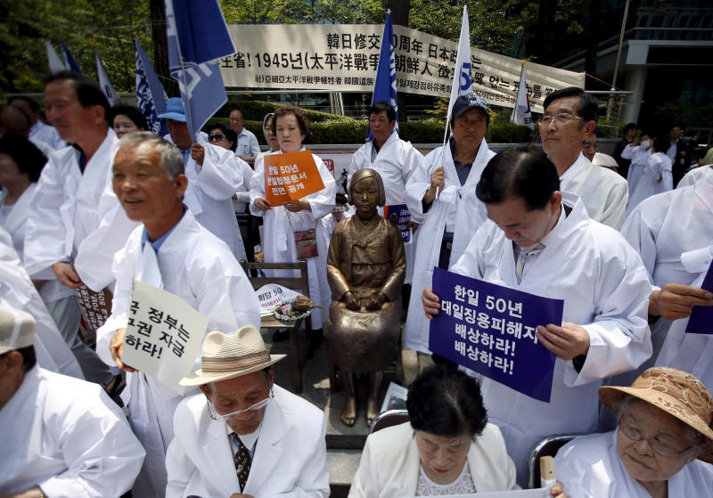 Descendants of Koreans who were conscripted to the Japanese imperial army or recruited for forced labour under Japan's colonisation at an anti-Japan rally in front of the Japanese embassy in Seoul on June 22, 2015.