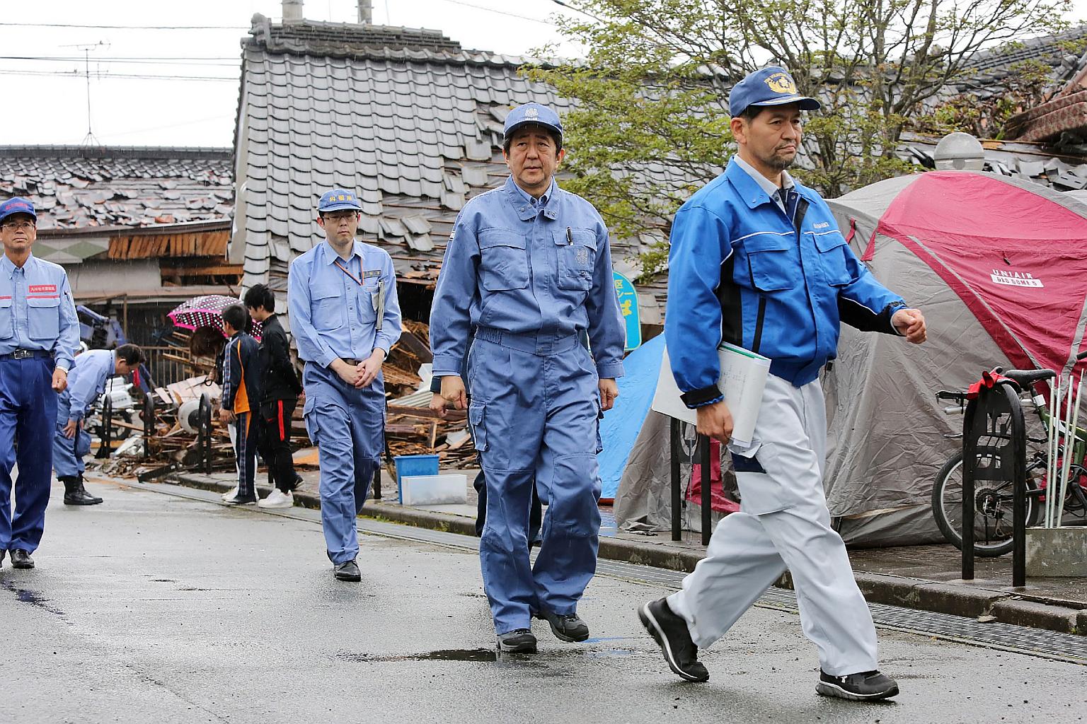 Japanese Prime Minister Shinzo Abe (centre) visits a earthquake affected area in Mashiki, Kumamoto prefecture, on April 23, 2016.