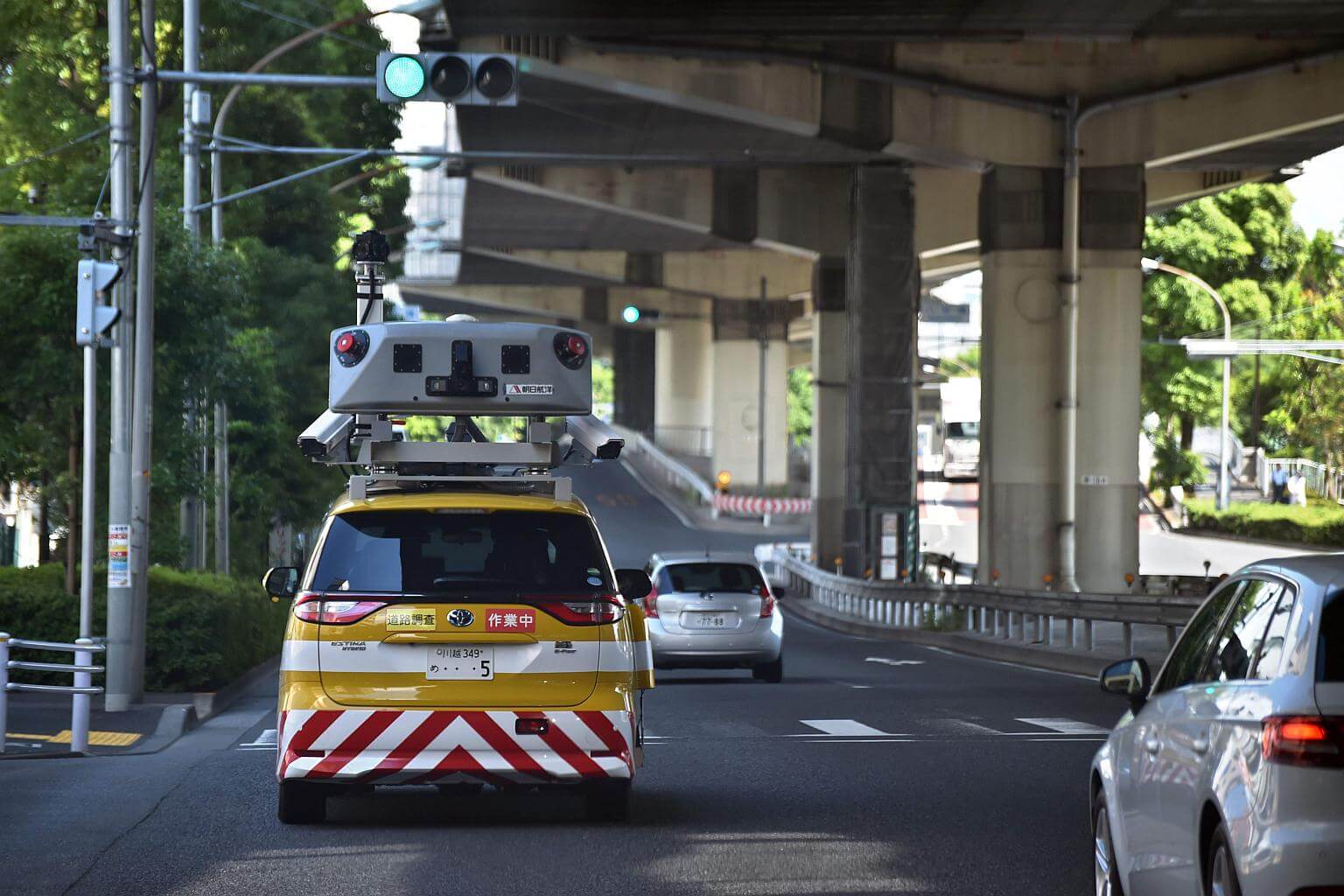 An Infra Doctor vehicle used by the Tokyo highway inspection system driving under a section of highway in Tokyo.