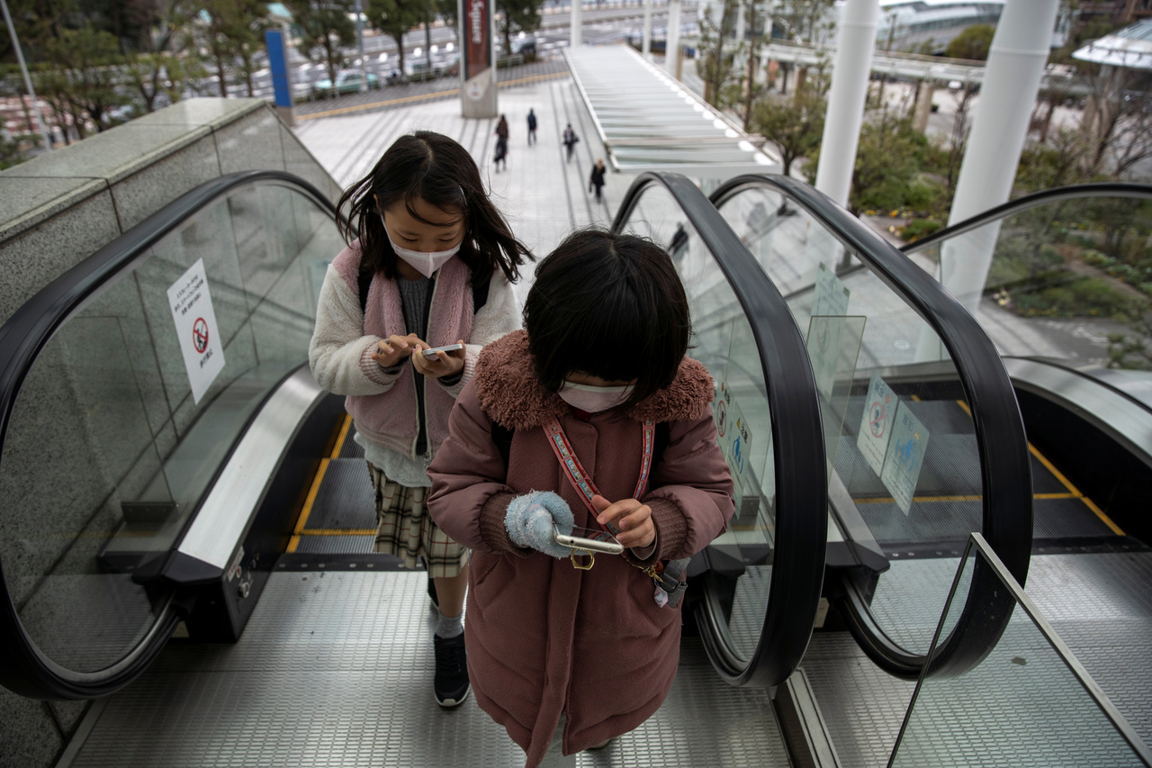 Children wearing face masks seen on a street in Tokyo on March 4, 2020.