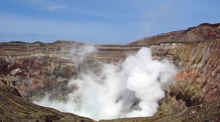 A screenshot of Mount Aso from an online video.