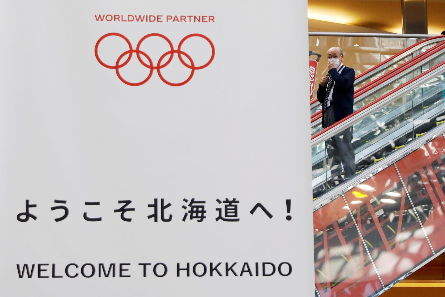 A man wearing protective face mask seen next to a campaign banner for Tokyo 2020 Olympic Games at New Chitose Airport in Hokkaido, Japan on Feb 27, 2020.