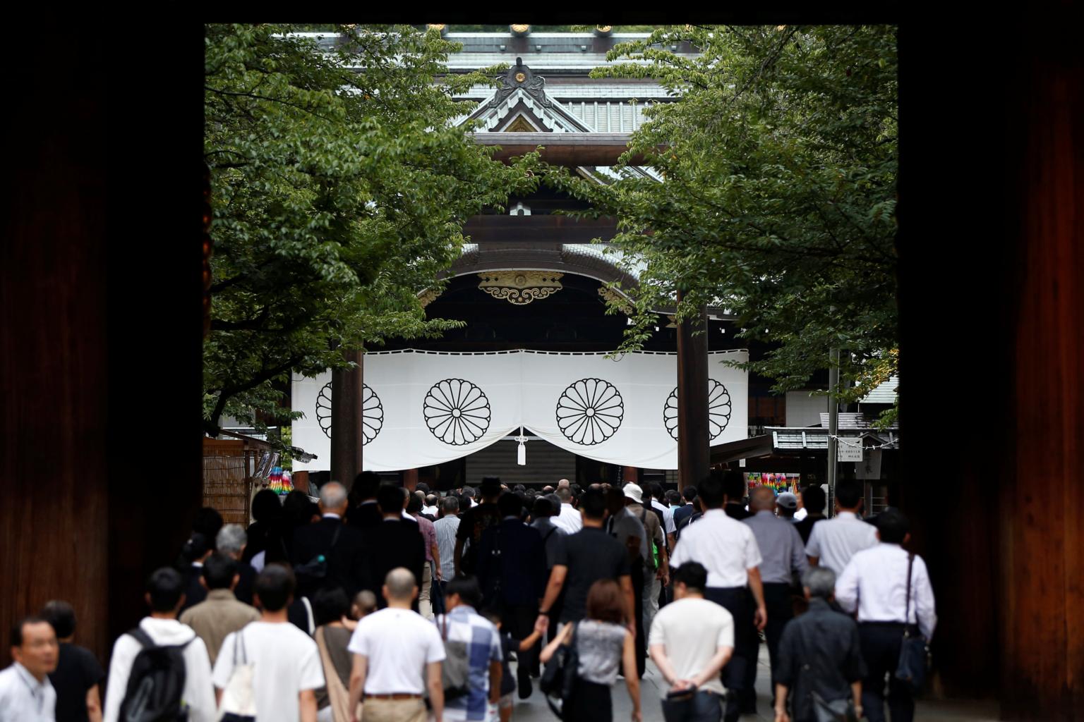 Visitors walking to the main shrine as they pay tribute to the war dead at Yasukuni Shrine in Tokyo, Japan, on Aug 15, 2017.