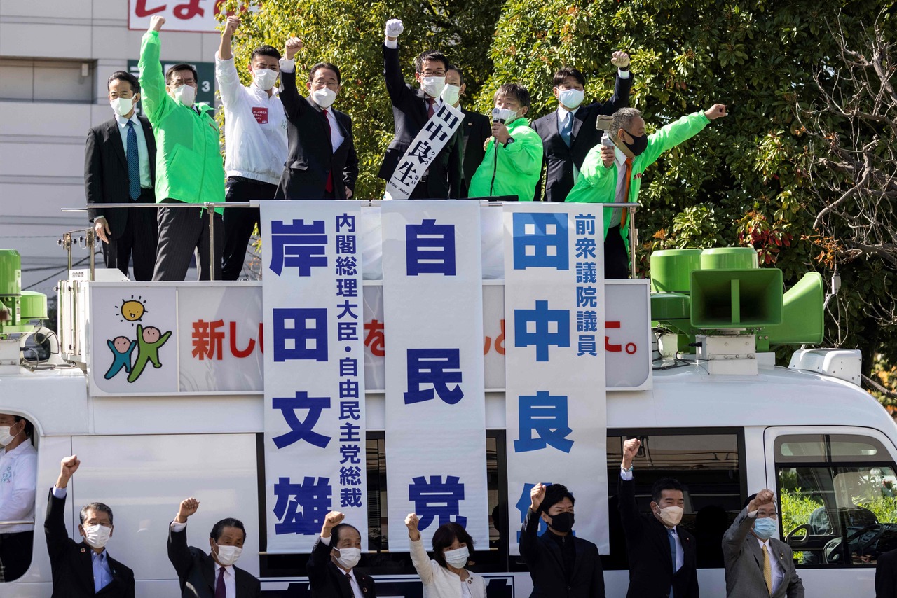 Members of the Liberal Democratic Party raise their fists during an election campaign in Saitama, Japan on Oct 30, 2021.