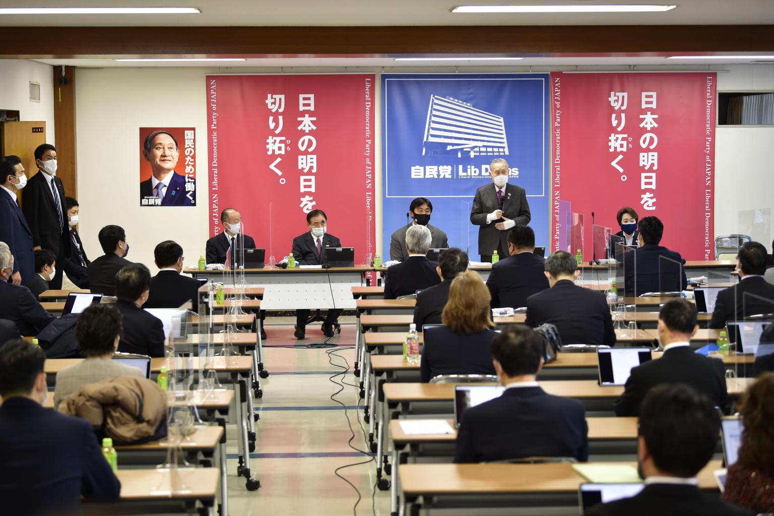 Yoshiro Mori delivers a speech at a meeting at the Liberal Democratic Party headquarters in Tokyo, on Feb 2, 2021.