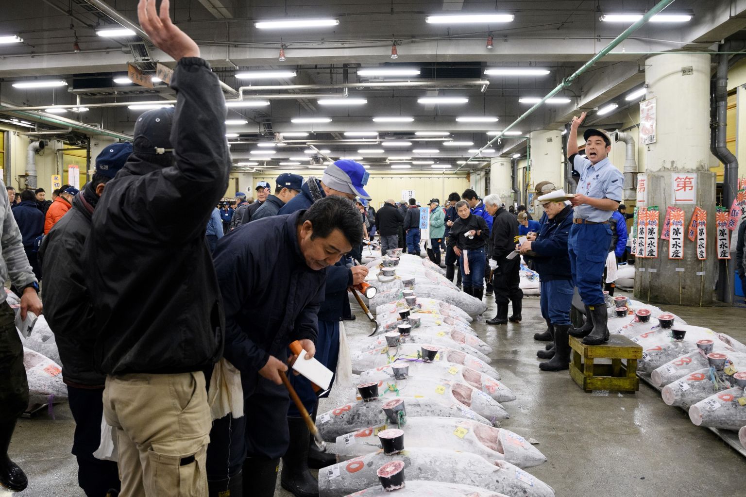 A buyer gestures as he place a bid during the first auction of the year at Tsukiji Market in Tokyo, Japan, on Jan 5, 2018.
