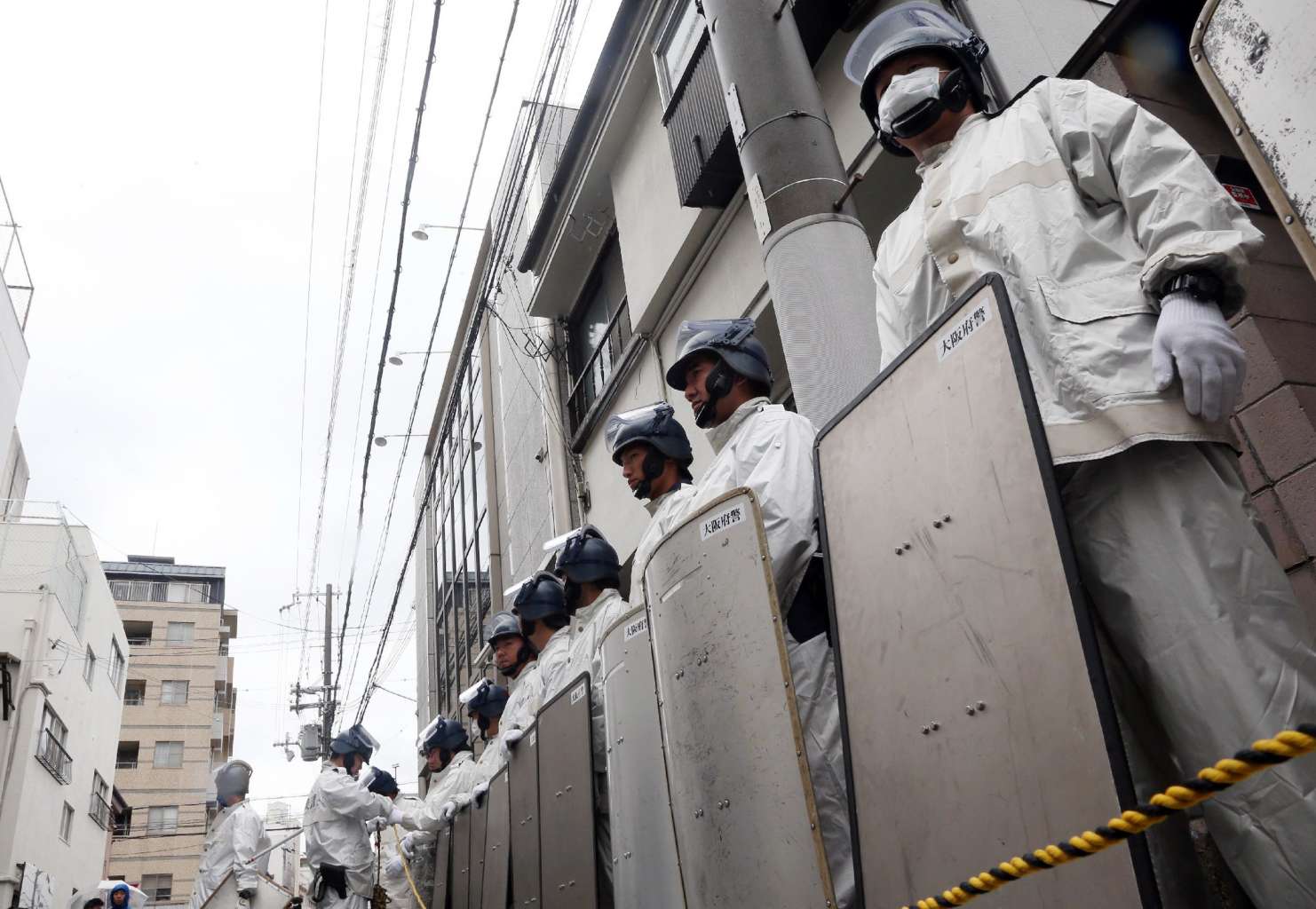 Japanese riot police stand guard outside of the headquarters of the "yakuza" crime syndicate, the "Yamaken-gumi", during a police raid on the building in Kobe, on Sept 9, 2015.