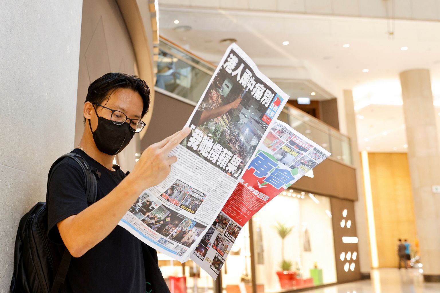 A June 2021 photo shows an Apple Daily supporter reading the final Hong Kong edition of the newspaper at a mall in Hong Kong.