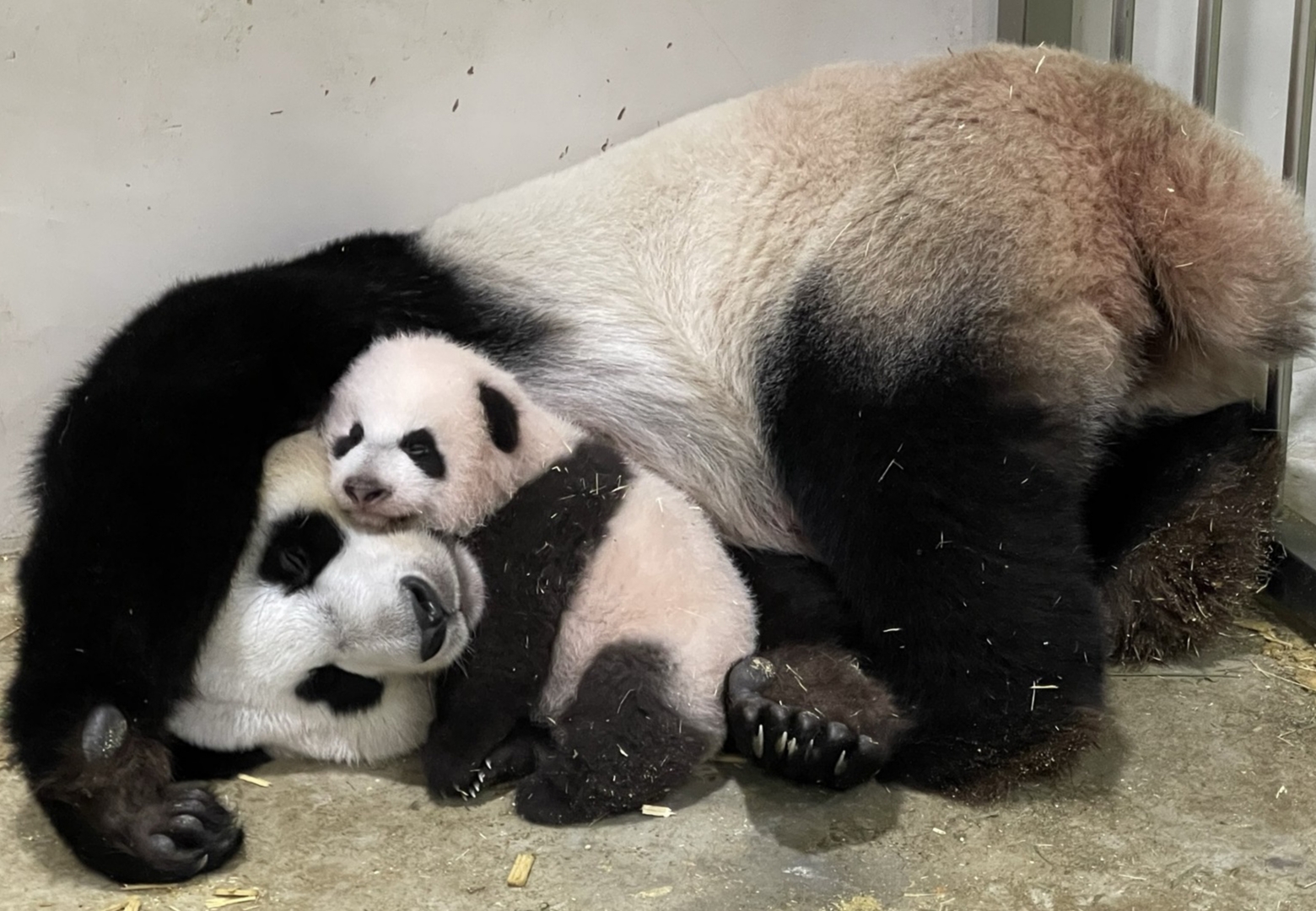 The 82-day-old giant panda cub sticking close to mum Jia Jia earlier on Nov 3, 2021.