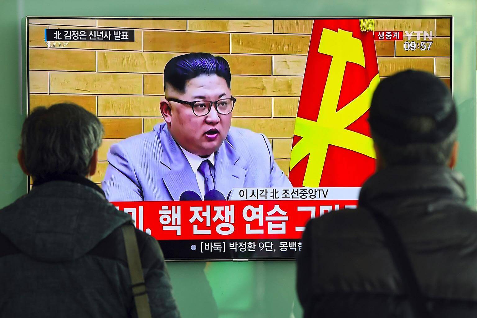 People watch a television news broadcast showing North Korean leader Kim Jong Un's New Year's speech, at a railway station in Seoul on Jan 1, 2018.
