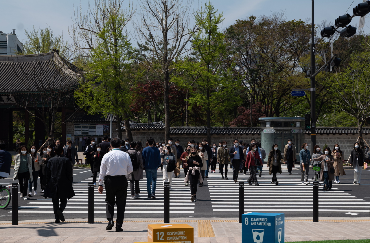 People walking at a main street in Seoul on April 15, 2021.