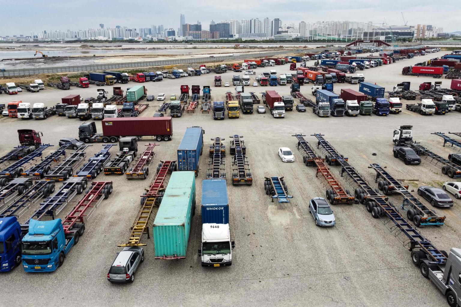 Trucks parked near a container port in Incheon, South Korea, as part of a strike on June 14, 2022.