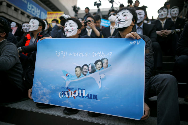 People holding a banner showing the relatives of Korean Air chairman Cho Yang Ho during a protest on May 4, 2018.