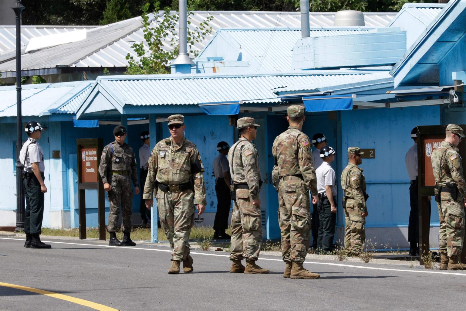 South Korean and US Army soldiers standing guard at the border village of Panmunjom in the Demilitarized Zone, on Sept 7, 2018.