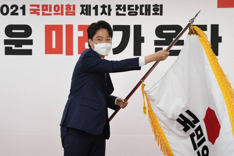 Lee Jun-seok, newly elected chairman of the main opposition People Power Party (PPP), waves the party's flag after being elected at their headquarters in Seoul on June 11, 2021.