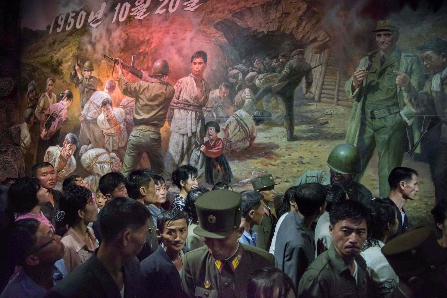 North Korean visitors walking past a painting showing US soldiers preparing to kill people at the Sinchon Museum of American War Atrocities in Sinchon, south of Pyongyang.