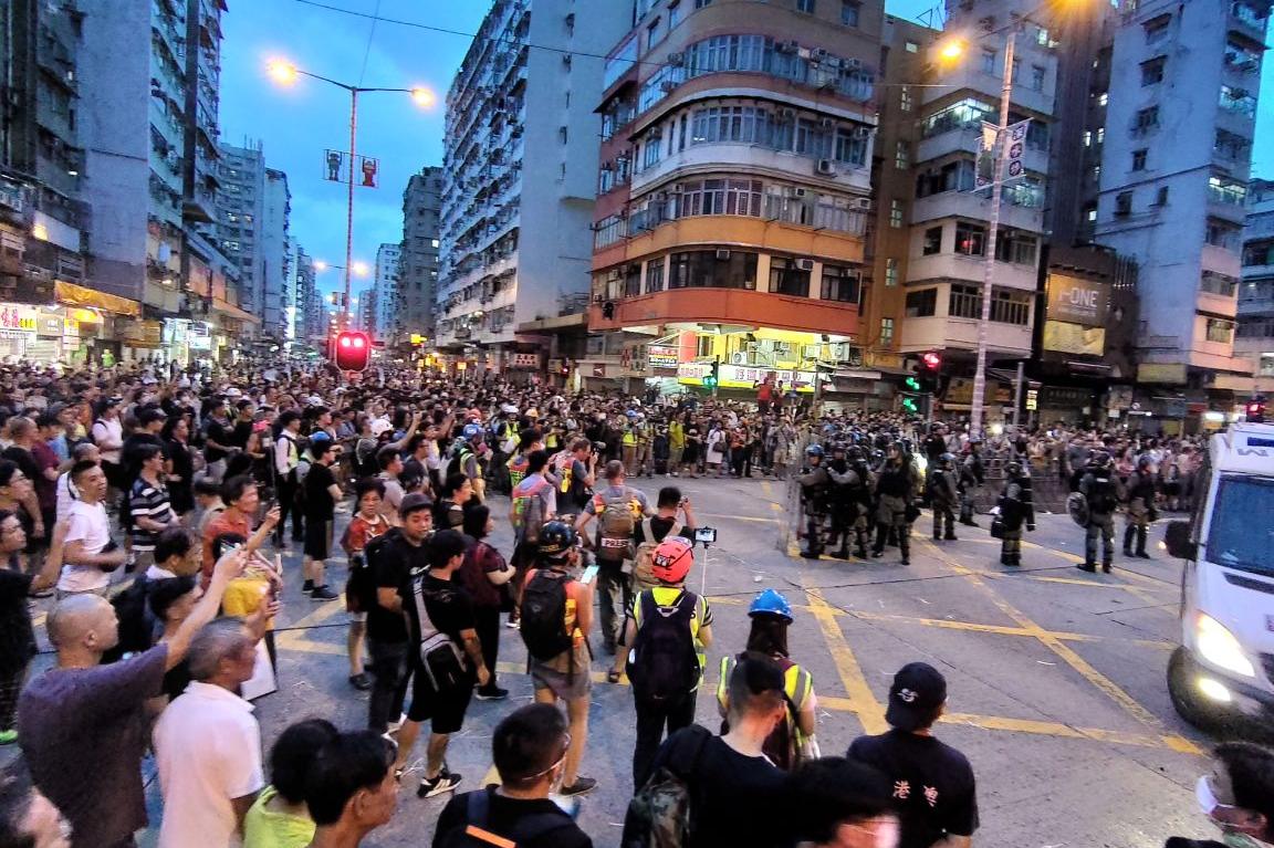 Police face a massed crowd of locals at the intersection of Cheung Sha Wan Rd and Yen Chow St in the Sham Shui Po neighbourhood after arresting a protester on Aug 11, 2019.