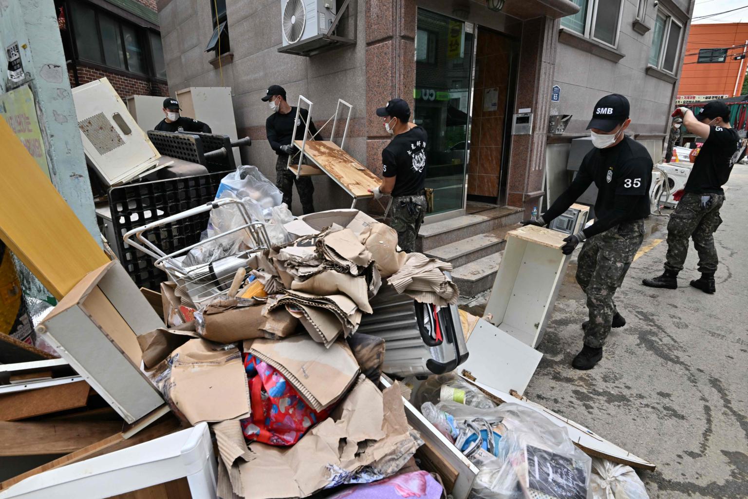 Soldiers clear debris from a residential area in Seoul on Aug 10, 2022.