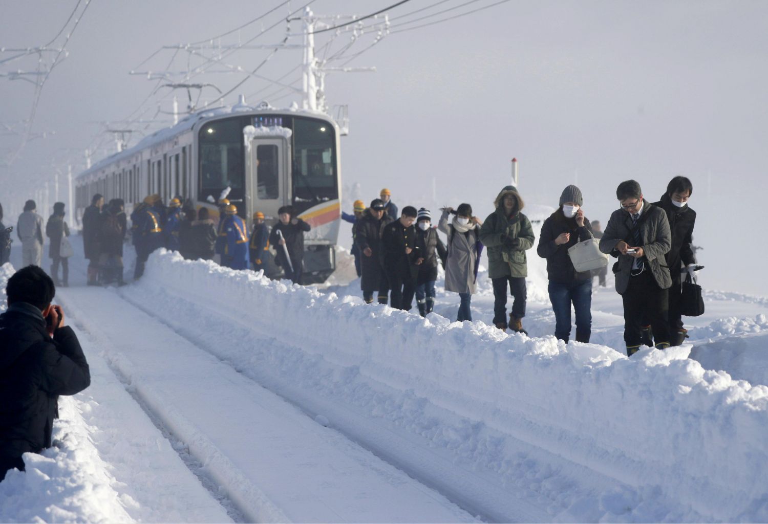 Passengers alight a train on East Japan Railway Co.'s Shinetsu Line, where they spent the night after it was stranded between stations due to heavy snowfall, in Sanjo, Niigata Prefecture, on Jan 12, 2018.