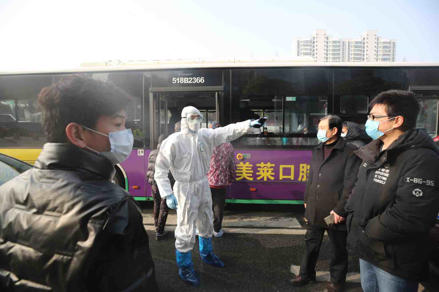 A medical worker gives instructions to people at a hospital in Wuhan on March 14, 2020.