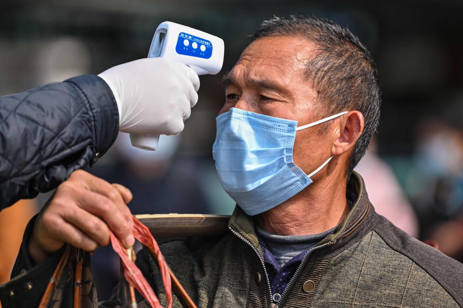 A man has his temperature checked as he leaves the Hankou railway station in Wuhan on April 4, 2020.
