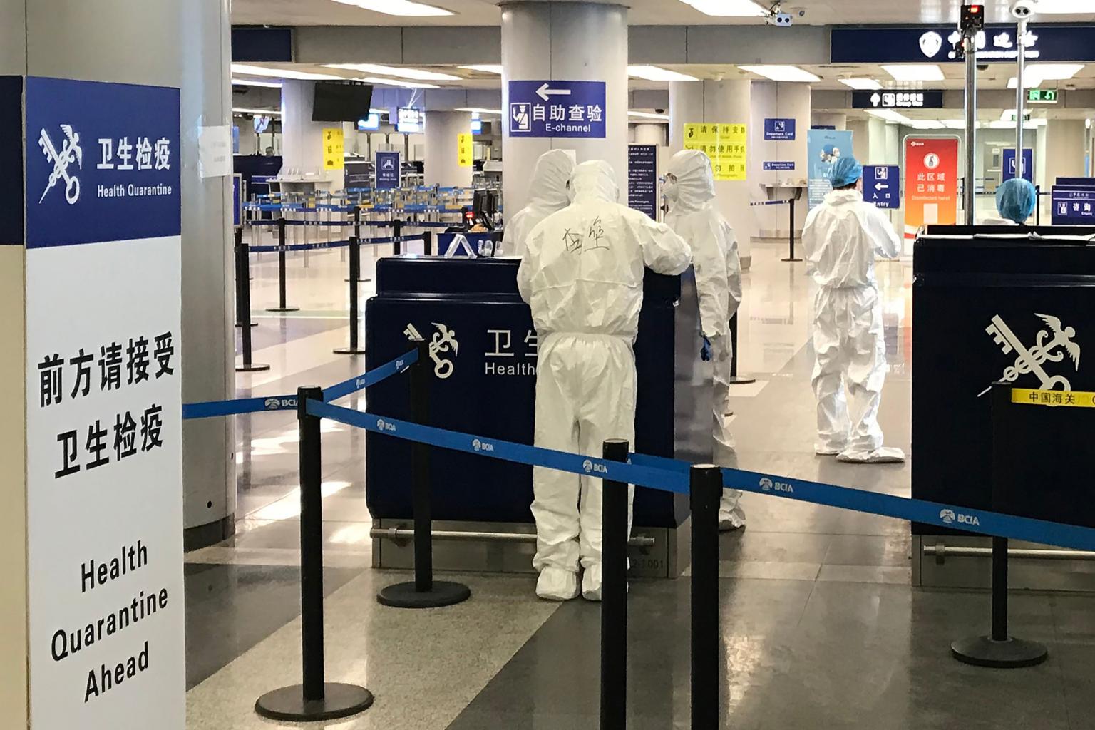 A photo taken on March 21, 2020, shows staff wearing protective suits at the health check counter in the international departures area of Beijing airport.