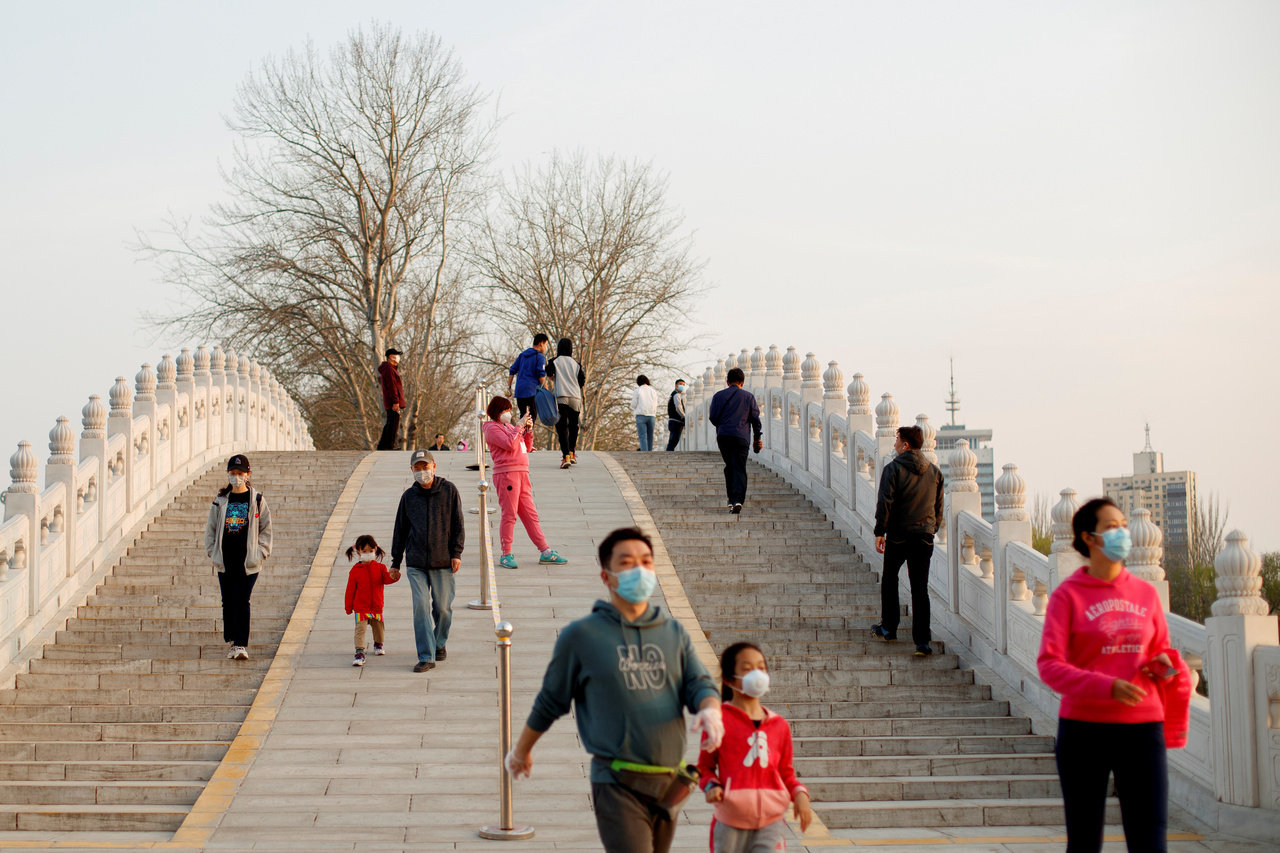 People wearing protective masks walk in a park in Beijing on March 23, 2020.