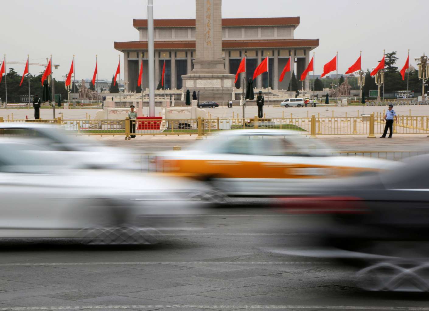 Cars pass by the Mausoleum of the late Mao Zedong and the Monument to the People's Heroes at Tiananmen Square in Beijing, on May 31, 2016.