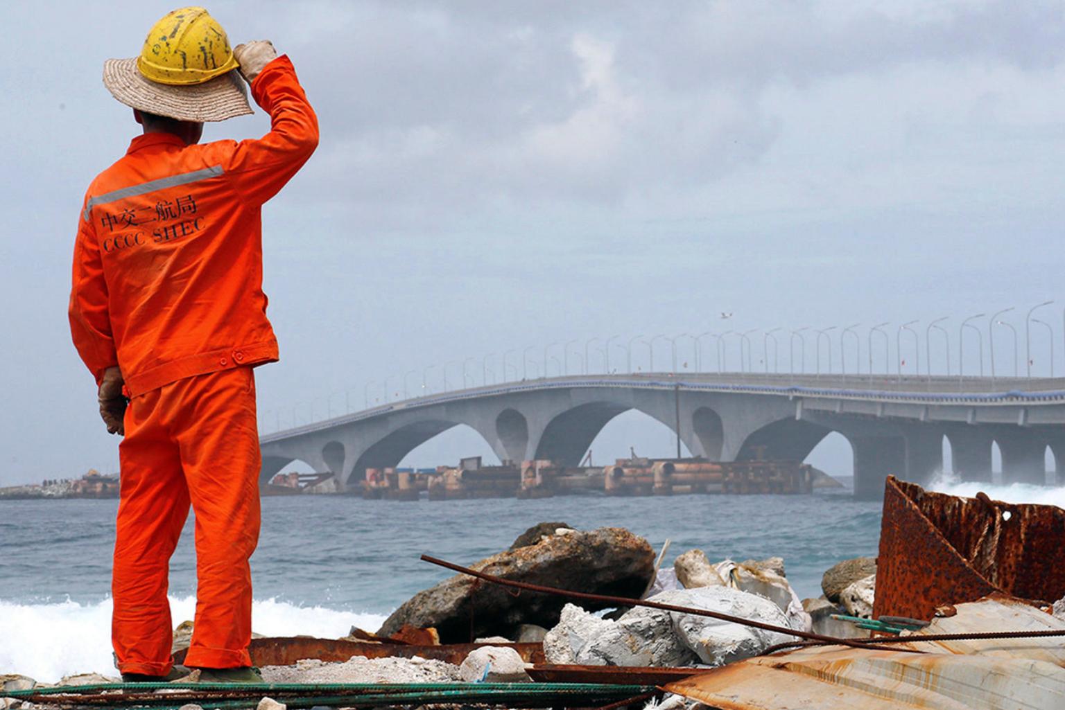A construction worker looks at the China-funded Sinamale bridge, in Male, Maldives, on Sept 18, 2018.