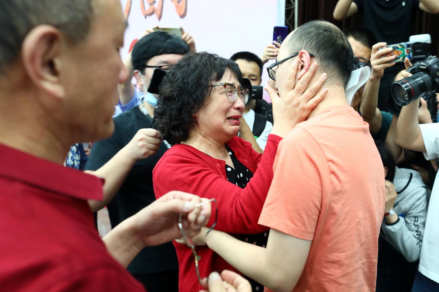 Mao Yin reunites with his mother (centre) and father (left) in Xi'an, China, on May 18, 2020.