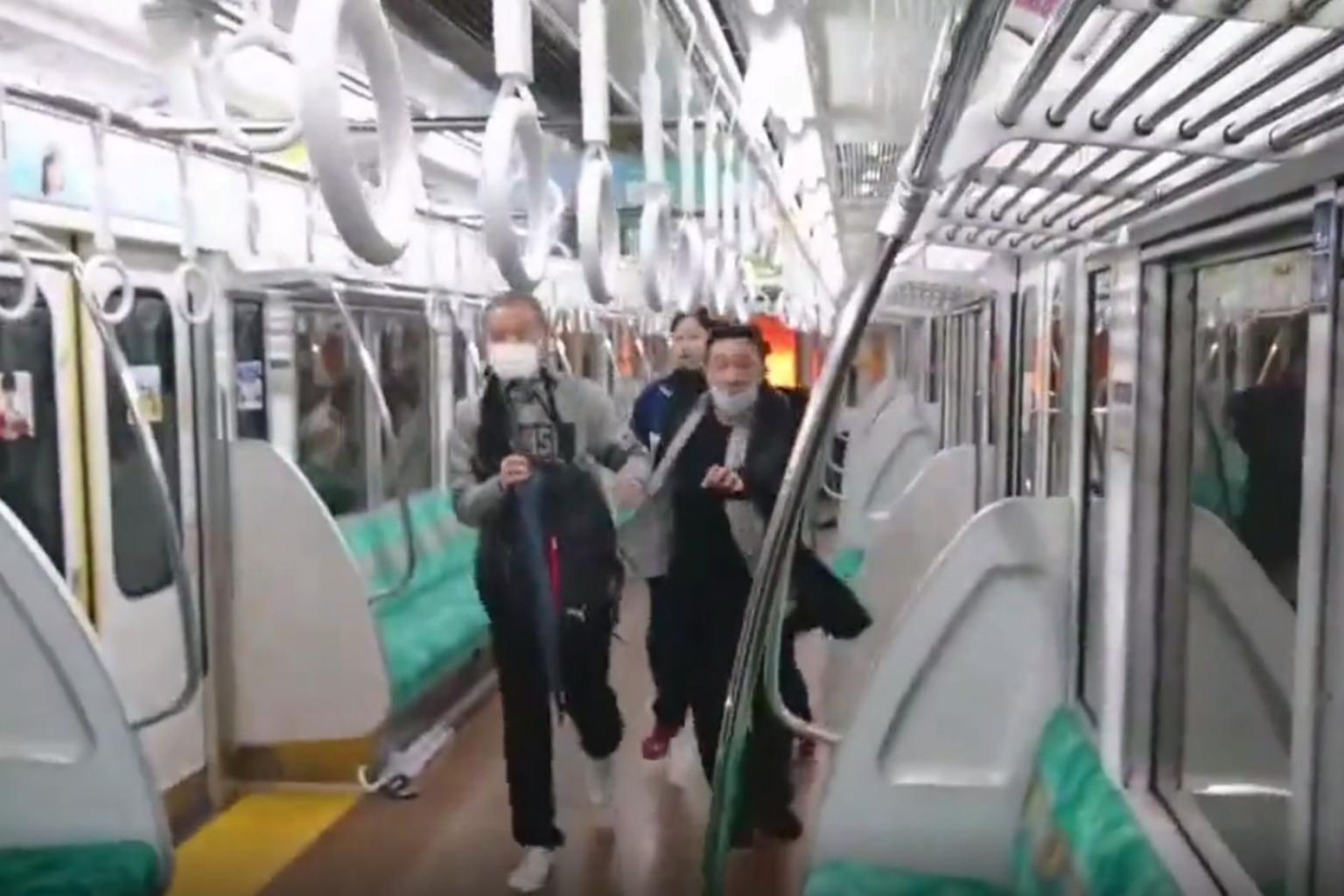 One video uploaded on Twitter and broadcast on NHK showed a steady stream of people running away from a train car where, seconds later, a small explosion caused a fire.