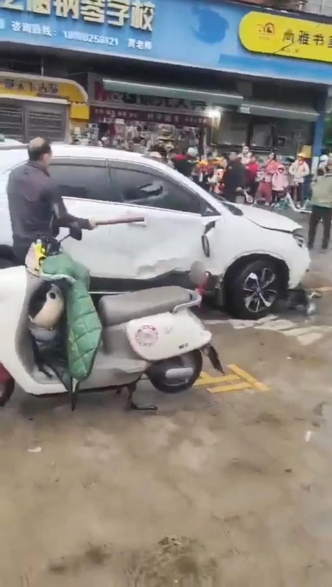 A man breaks a car’s window following a vehicle collision outside a primary school in Changde, Hunan province, in this screengrab obtained from social media video.