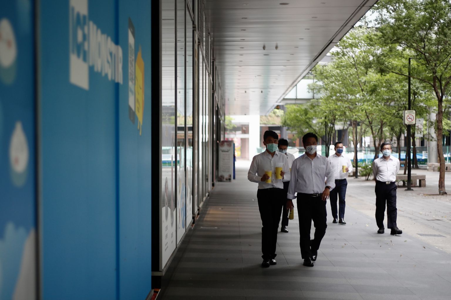 Office workers walk with their takeaway food and drinks in Taipei, Taiwan, on May 24, 2021.