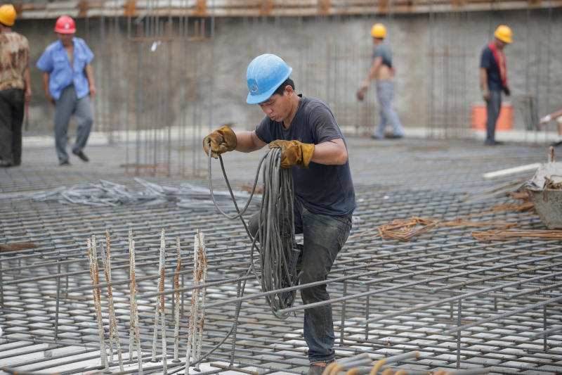 File photo showing a migrant worker from Baoding, Hebei province, laying a cable at a construction site in Beijing, China.