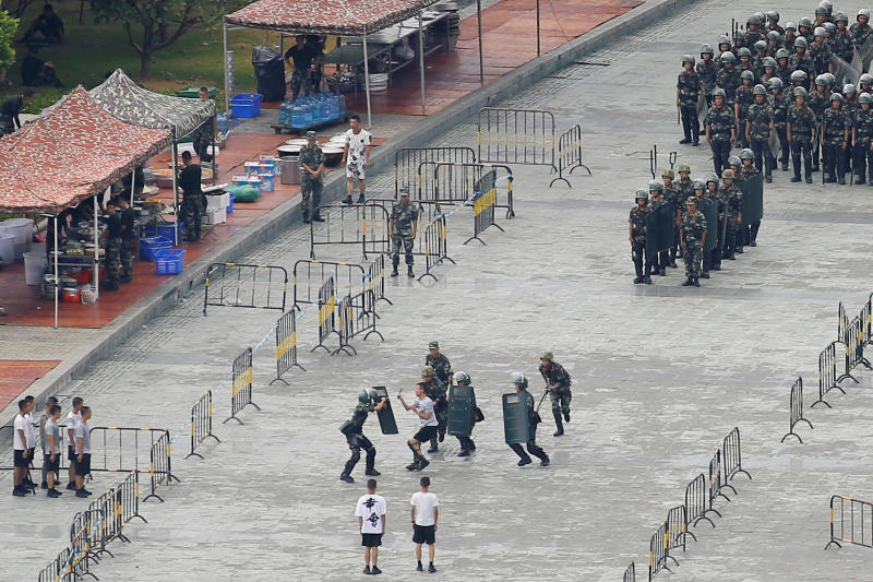 Chinese servicemen during a crowd control exercise at the Shenzhen Bay Sports Center in Shenzhen, which is across the bay from Hong Kong, on Aug 16, 2019.