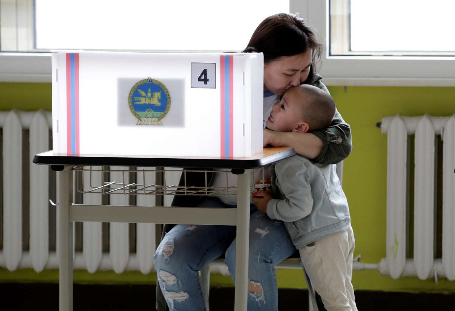 A mother kissing her son at a polling station in Ulaanbaatar on June 29.