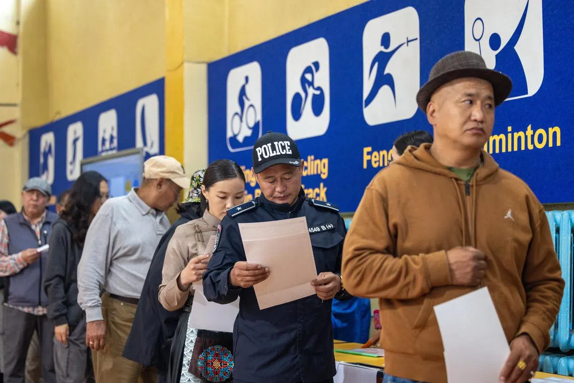 People queue to vote during the Mongolian parliamentary elections at a polling station in Ulaanbaatar, Mongolia.