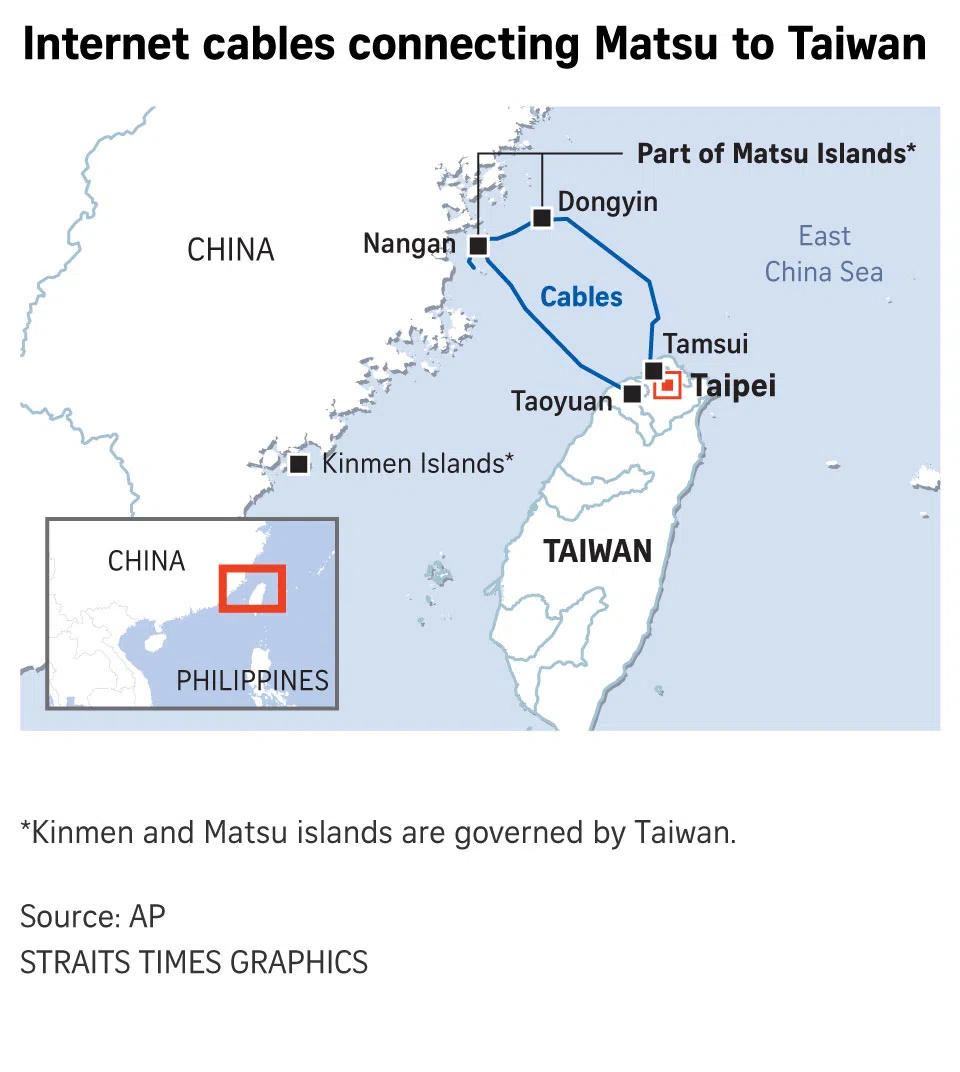 Taiwan’s National Communications Commission suspects that the cables were damaged by two Chinese vessels, the first a fishing vessel on Feb 2 and the second a cargo ship on Feb 8.