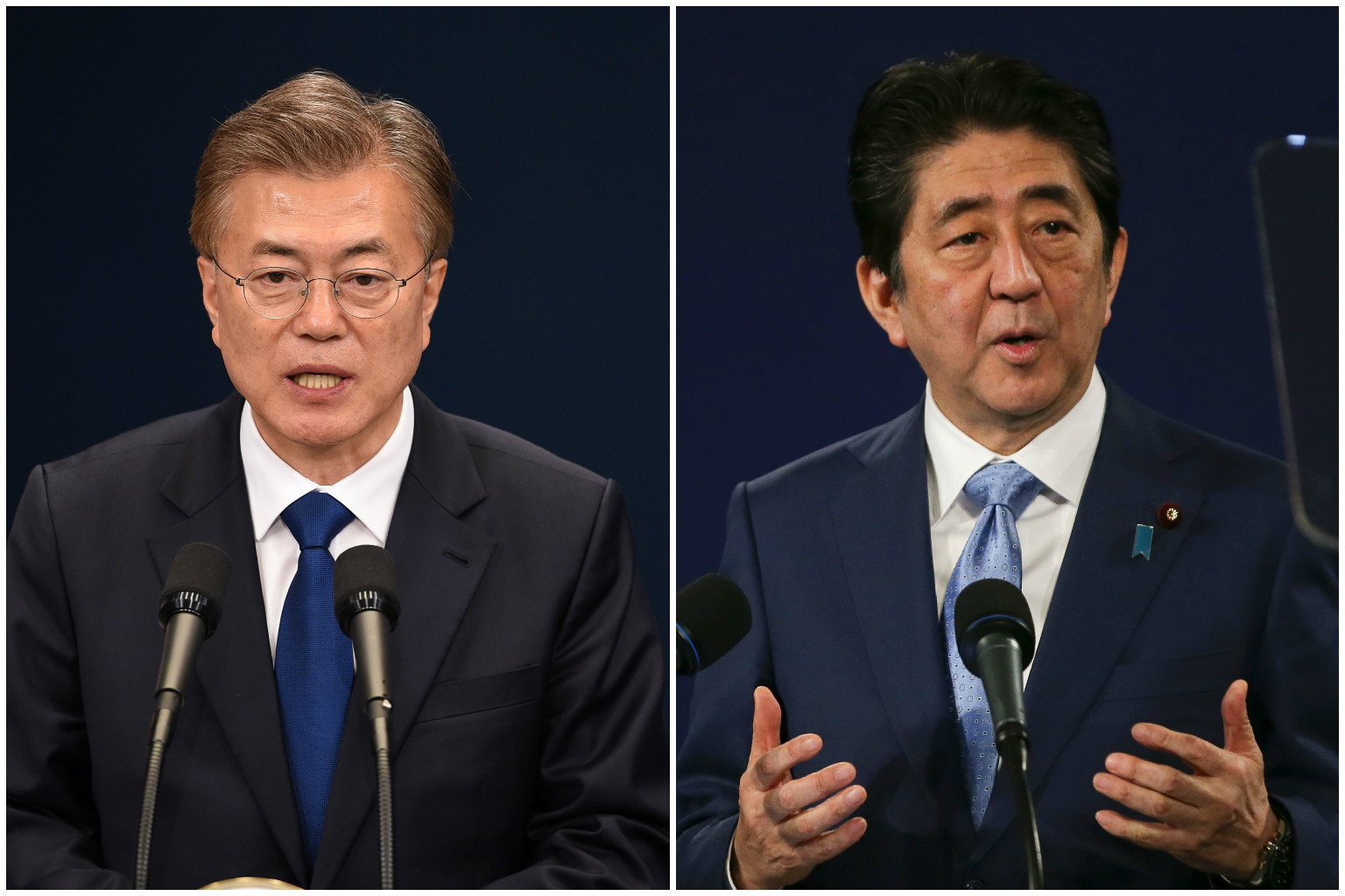 South Korean President Moon Jae In (left) and Japanese Prime Minister Shinzo Abe have agreed to hold a bilateral summit meeting at an early date.