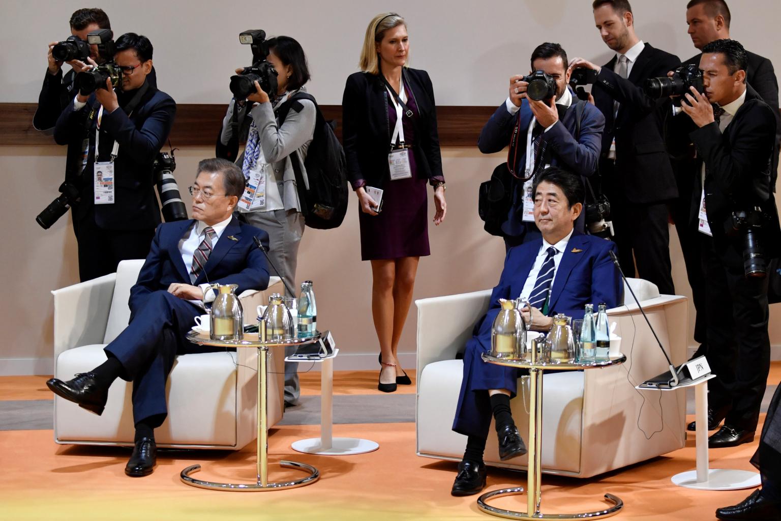 South Korea's President Moon Jae In (left) and Japan's Prime Minister Shinzo Abe sit at the start at the start of the "retreat meeting" on the first day of the G20 summit in Hamburg, Germany, on July 7, 2017.