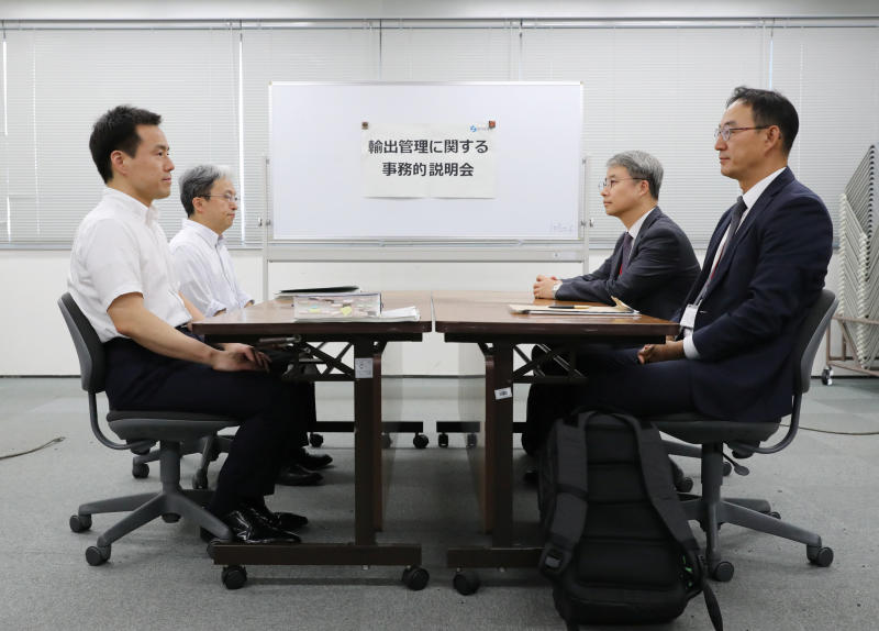 Working level officials from Japan (left) and South Korea hold a meeting about Japan's recent restrictions on exports of high-tech material to South Korea in Tokyo on July 12, 2019.